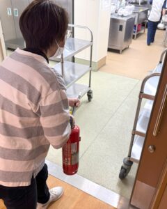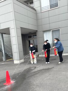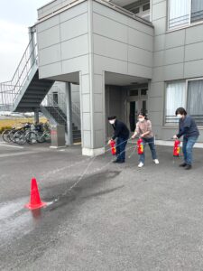 また、消火器の使い方について、水消火器を使って、訓練を行いました。