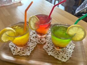 炭酸水とカラフルなシロップ、色とりどりのゼリー、飾りにレモンを用意し、お好きな色を選んでいただきました🟠