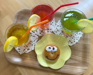 完成したカラフルゼリージュースと一緒に、デコレ―ジョンしたミニあんぱんを一緒に提供しました!!!