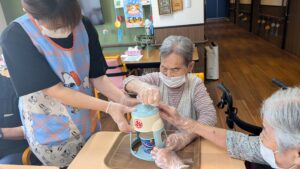 ソレイユ思川では、まだまだ暑い日が続いているため、お客様より大人気のかき氷作りを行いました!!!