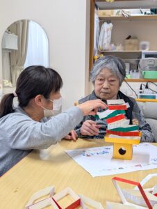 菱餅積み上げゲームでは、「上手に積めるかな?」「菱餅が揺れてるよ~」苦戦中💦